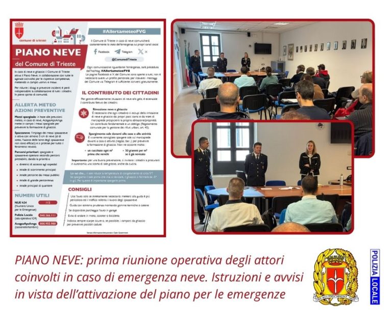 Istruzioni e avvisi in vista dell’attivazione del piano per le emergenze Ieri mattina1 si è svolta, nella sede della Polizia Locale di via Revoltella, una riunione organizzativa con tutti gli attori coinvolti nel Piano Neve comunale, attivo dal prossimo 1°
